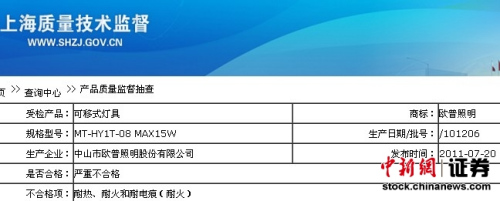 2011年2季度,上海质监局共抽查19批次产品,经检验,7批次产品不合格且质量问题严重。其中欧普照明一款规格型号为“MT-HY1T-08 MAX15W”的可移式灯具耐热、耐火和耐电痕不合格,生产日期/批号为101206。