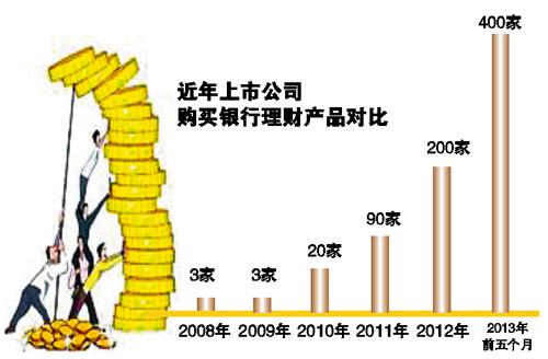 其实,这只是今年以来上市公司理财热的一个缩影。同花顺数据显示,2008年和2009年,仅有3家公司发布购买银行理财产品的公告;2010年这一数据上升到20家左右;2011年超过90家,增长了近4倍;2012年再度翻番,达到200余家;而2013年,仅前5个月就超过了400家,光5月份就有66家。