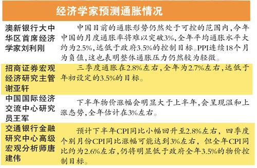 澳新银行大中华区首席经济学家刘利刚昨天对本报记者表示:“尽管CPI同比增速低于上月,但事实上通胀势头却在8月份有所上升,其主因是受到食品价格上升的推动。整体来看,中国目前的通胀形势仍然处于可控的范围内,今年中国的月度通胀率将难以突破3%,全年平均通胀水平大约为2.5%,这也远低于政府3.5%的控制目标。