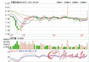 受市场传闻、高管人事变更消息的影响,中国石油(601857)昨日上午停牌,下午复牌之后,股价大幅上涨,以8.07元报收,涨2.03%。同期石化板块整体上涨,另外一只龙头股中国石化600028日涨幅为2.44%,大红柱报收,且连续6个交易日均以红柱报收,有股价蓄势待发的迹象。