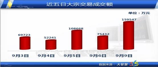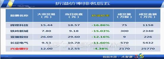 9月9日大宗交易折溢价率排名后5中,成交金额最大的股票为兴业银行,以折价4.38%成交25770万元。另外四只股票辉煌科技、铁岭新城、亚厦股份和长征电气的成交金额分别是1158万元、2340万元、226万元和5432万元。