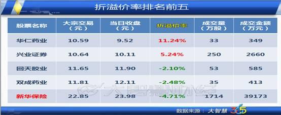 9月9日大宗交易折溢价率排名前5中,华仁药业和兴业证券均为溢价交易,其中华仁药业以溢价11.24%成交349万元,兴业证券以溢价5.24%成交2660万元。另外三只股票新华保险、回天胶业和双成药业分别折价成交了39173万元、585万元和413万元,其中新华保险成交金额最大。