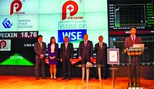 中国培新国际公司9日正式在波兰华沙证券交易所上市,成为首家在波兰上市的中国公司。培新国际公司此次在华沙公开发售100万股,其中20万股面向私人投资者,单股发行价格为16兹罗提(约合5美元)。华沙证券交易所是中东欧地区规模最大的有价证券交易市场,同时也是欧洲发展最快的交易市场之一。图为中国驻波兰大使徐坚(右)在培新公司上市仪式上致辞。 (新华社/图文)