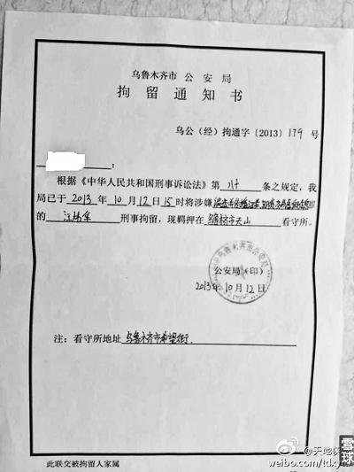 在昨天的雪球网上,@唐纳德的一则微博发布了网友“天地侠影”被拘留的消息,其大意是:律师第一次见到“天地侠影”,受其委托发布这条消息。他告诉我们举报方是广汇能源。迄今为止,我们还没有听到别的人因为同样的举报被拘留,如果哪位有更多的信息请告知。附上他的拘留通知书,涂掉的是家人的名字。