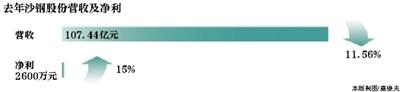 根据公司2013年业绩快报,去年全年沙钢股份实现营收107.44亿元,同比下降11.56%,去年全年净利为2600万元。