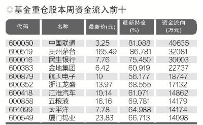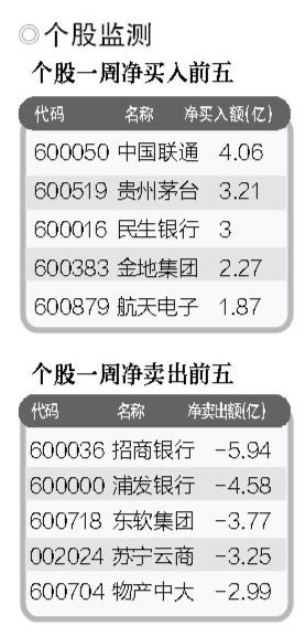 个股方面,统计显示两市仅635只个股呈现资金净流入,1826只个股呈现资金净流出,中国联通、贵州茅台、民生银行、金地集团等超跌蓝筹股净流入排名靠前。一周分别净流入4.06亿元、3.21亿元、3.00亿元、2.27亿元,招商银行、浦发银行、东软集团等3股净流出居前,分别净流出5.94亿元、4.58亿元、3.77亿元。