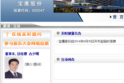从6月30日以“市场出现有关公司实际控制人、董事长古少明的言论需要核实”为由停牌,宝鹰股份迄今依然没有复牌迹象。而昨天该公司管理层核心人士对媒体透露,公司也未能联系上其董事长古少明。