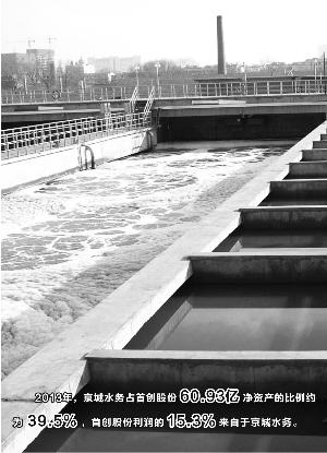 截至去年底,京城水务总资产48.19亿元,净资产47.17亿元,2013年全年营收6.1亿元,净利润1.8亿元。而母公司首创股份截至2013年底的净资产为60.93亿元,全年营业收入42.31亿元,净利润6.01亿元。以股份占比51%计算,2013年,京城水务占首创股份60.93亿净资产的比例约为39.5%,首创股份利润的15.3%来自于京城水务。