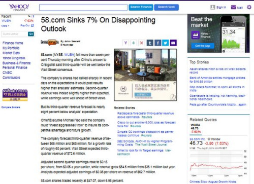 58同城第三季度营收预期比华尔街预测低 股价大跌7.36%