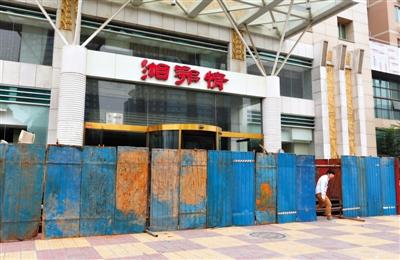 2014年9月25日,湘鄂情北四环店由于租约未谈拢与物业发生冲突,物业方在店门口搭起了围挡。新京报记者 浦峰 摄