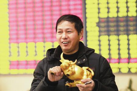 近日,IPO压力导致A股宽幅震荡,但市场人气依然鼎沸。图为一名股民在证劵营业厅内手持“金牛”留影。 新华社发