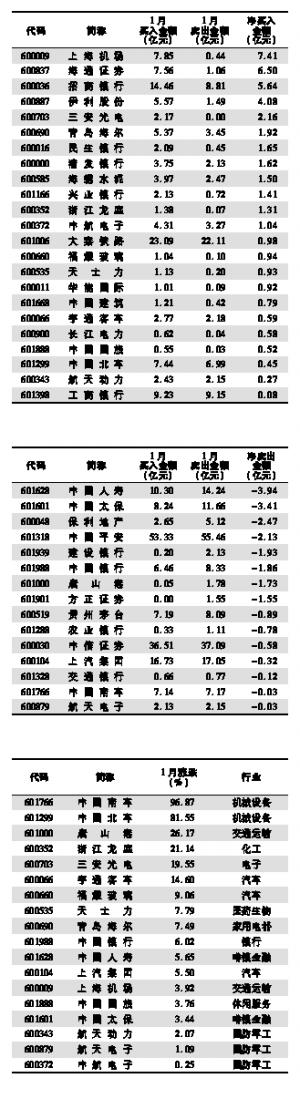 1月沪指区间震荡,累计跌幅0.75%,终结八连阳走势。权重股扎堆的沪股通指数跌幅2.59%,远远弱于大盘。受行情低迷影响,沪股通成交萎缩,1月累计买入556.04亿元,卖出442.83亿元,净买入金额113.21亿元,较去年12月下降六成。据统计,1月沪股通成交活跃股共计38只,其中,10只首次入围,值得关注的是,新入围股军工行业占比最高,达到三成。