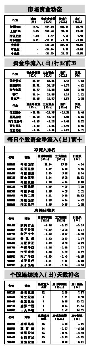 指数方面,上证180指数成份股合计资金流入109.46亿元,深证成指成份股资金流入6.37亿元,沪深300指数成份股资金流入125.03亿元。以股本规模计,流通盘中大盘股资金流入136.20亿元,中盘股资金流出24.64亿元,小盘股资金流出35.53亿元。