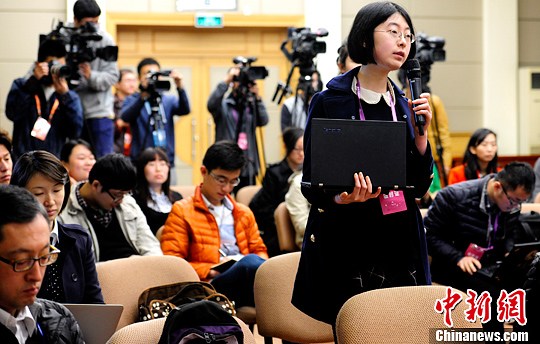 图为中新社记者在国务院政策例行吹风会上提问。中新社发 张勤 摄