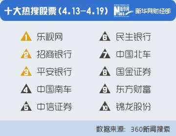 据360新闻搜索数据,截至2015年4月19日,入选A股一周股票热搜榜前十位的公司依次是乐视网、招商银行、平安银行、中国南车、中信证券、民生银行、中国北车、国金证券、东方财富、锦龙股份。