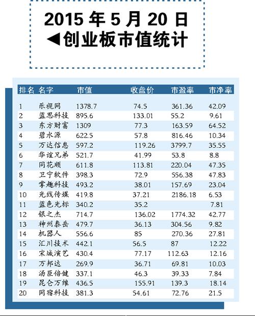 77只创业板股票市值超200亿 乐视网市值超9个搜狐