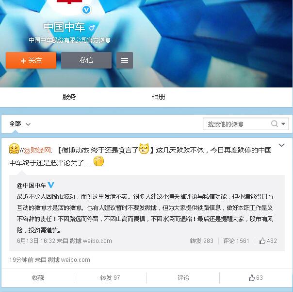 因为连续的跌停,中国中车被股民调侃称“灵车”。因此,最近其官方微博@中国中车已沦为“深受伤害”的股民们吐槽和泄愤之地。就在3天前,中国中车的官方微博仍信誓旦旦保证绝对不关微博评论。然而,今天官微@中国中车发布的几条微博的评论已经全部关闭!