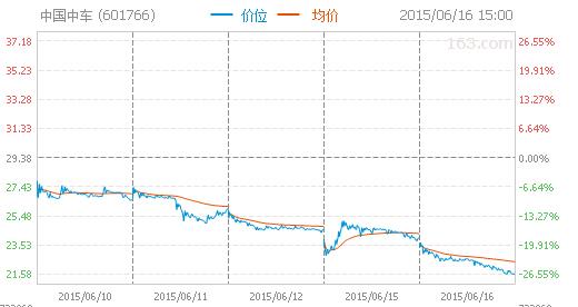 央广网北京6月16日消息 截止收盘,中国中车跌幅10.01%,报收21.58元/股,相对于复牌后的最高价35.64元/股,大跌近40%。
