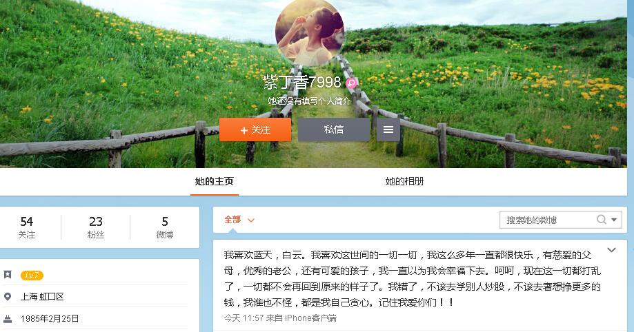 登录其微博页面看到了今日所发状态“我喜欢蓝天,白云。我喜欢这世间的一切一切,我这么多年一直都很快乐,有慈爱的父母,优秀的老公,还有可爱的孩子,我一直以为我会幸福下去。呵呵,现在这一切都打乱了,一切都不会再回到原来的样子了。我错了,不该去学别人炒股,不该去奢想挣更多的钱,我谁也不怪,都是我自己贪心。记住我爱你们!!”