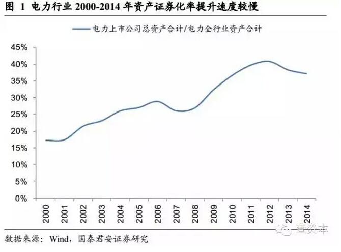 1.空间:电力行业资产证券化率从2000年的17.21%提升至2014年37.08%,增速较慢且尚有较大提升空间,在本轮国企改革政策驱动下,电力行业资产证券化有望提速。