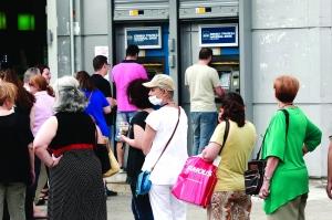 希腊雅典,民众排队在银行外的ATM取款机前等待提取现金。CFP/供图
