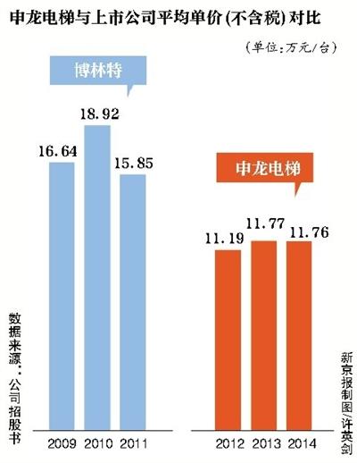 较低的价格也许是申龙电梯开拓市场的法宝。一位电梯行业业内人士也对记者表示:“一般四米多高的楼层扶梯售价大约在不到20万元。”2012年至2014年,公司自动扶梯产品销售平均单价(不含税)分别为11.19万元/台、11.77万元/台、11.76万元/台。而博林特2009年-2011年1~6月自动扶梯产品的行业平均售价为16.64万元、18.92万元和15.85万元。