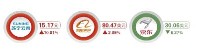苏宁与阿里合作首个交易日股票涨停 京东跌6.27%