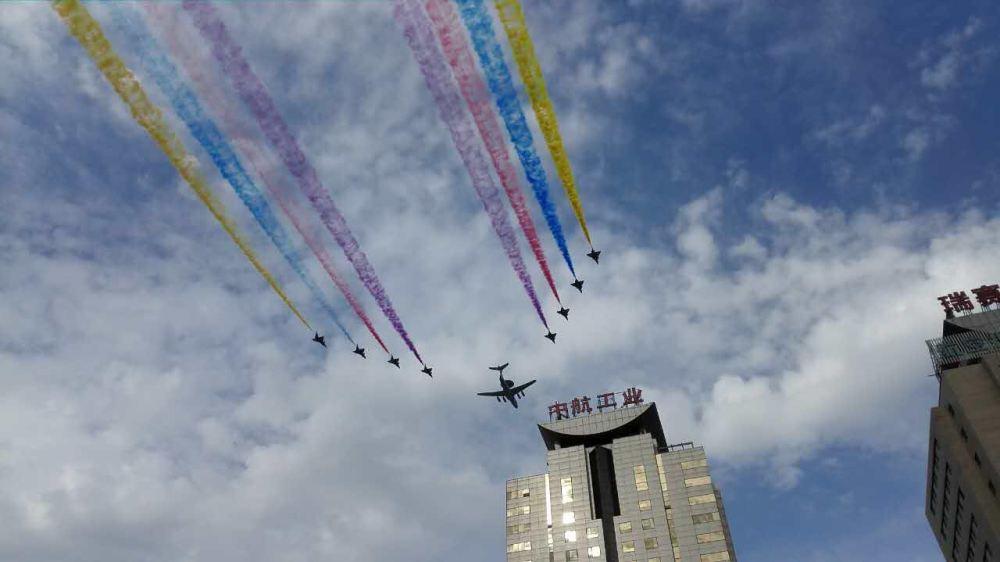 10个空中梯队,包括空中护旗方队、领队机梯队、预警指挥机梯队、轰炸机梯队、歼击机梯队、海军舰载机梯队、海上巡逻机梯队、加受油机梯队、直升机梯队,涵盖了中国军方现有先进作战和保障机种。