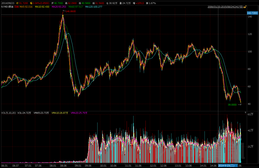 本周纽约原油期货连续八周下跌,盘中六年来首次跌破40美元;布伦特原油自2009年3月以来首度跌破每桶45美元。而时光回到2014年6月,当时油价还是在106美元/桶徘徊。