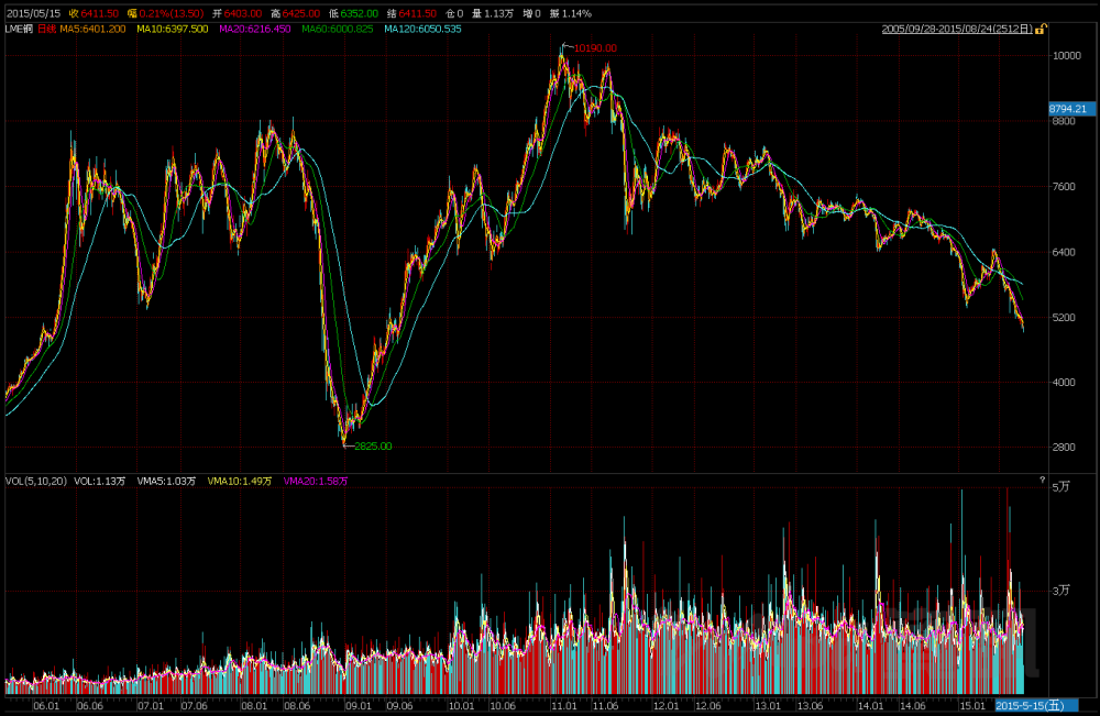 CNBC日前撰文称:“从镍、豆油、胶合板,再到糖,全球商品价格都在下挫,因全球经济增长失去动能.。。”下面是LME铜自2006年以来的走势,目前该价格已经跌破5000美元,未来可能继续下跌。