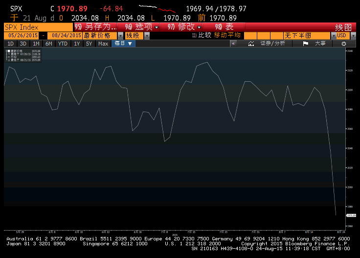 在美国,标普500指数的周期调整市盈率为27.2倍,比历史平均水平16.6高约64%。自1882年以来仅有三次标普500指数的周期调整市盈率高于这个平均水平,分别是1929年、2000年和2007年。下图为近三个月标普500指数走势,这跌势吓人哇!