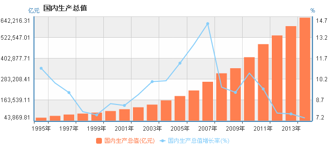 而如今,中国经济也遭遇发展瓶颈。官方数据显示,中国经济增长率在这25年里首次跌至7%左右,这可能意味着实际经济增长面临调整。下面是中国近20年经济增速图: