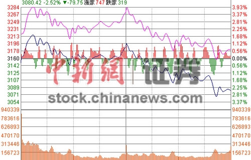 截至收盘,上证综指报收3080.42点,跌79.75点,跌幅2.52%,成交3027亿元;深成指报收9991.76点,跌63.04点,跌幅0.63%,成交2999亿元。创业板指报收1893.52点,涨38.49点,涨幅2.07%。两市成交相比前几个交易日明显萎缩。 (中新网证券频道)
