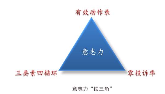 “有效动作录”、“三要素四循环”、“零投诉率”构成了一个一脉相承、优势互补的意志力“铁三角”,是中证万融最重要的三项核心习惯。其中,“有效动作录”是“一脉”、是根本,其他两项是“相承”、是“有效动作录”在团队和认错改错这两个维度的延伸。“铁三角”是我们锤炼意志力不起眼的沉默的强大力量,其巨大影响必将延伸到我们工作和生活的方方面面。