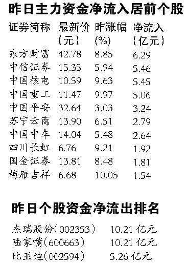 据广州日报记者统计,两市2350只在交易个股,1620只大单资金净流入,708只大单资金净流出,资金净流入795.6亿元,其中中国核电、中国重工、中国中车等3只个股大单资金净流入额分别为20.81亿元、19.69亿元、8.81亿元,居个股前三位。