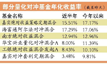 据统计,目前市场上共有包括嘉实绝对收益策略、嘉实对冲、海富通阿尔法对冲、南方绝对收益、华宝兴业量化对冲、工银瑞信绝对收益、中金绝对收益、广发对冲套利、华泰柏瑞量化绝对收益策略和东吴阿尔法在内的10只量化对冲公募基金。在前期A股回调的三个月中,这类产品的业绩表现突出。