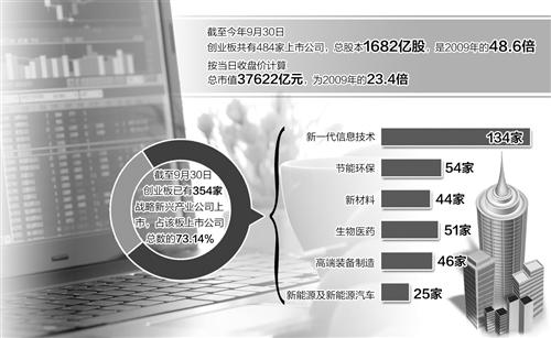截至9月30日,创业板已有354家战略新兴产业公司上市,占该板上市公司总数的73.14%,广泛覆盖新一代信息技术(134家)、节能环保(54家)、新材料(44家)、生物医药(51家)、高端装备制造(46家)、新能源及新能源汽车(25家)等领域,形成了鲜明的板块特色。去年创业板战略新兴产业公司分别贡献了创业板71%的营业收入、73%的净利润。