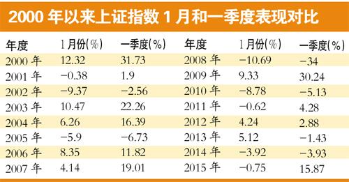 相对而言,一季度整体行情似乎更乐观一点。2000年以来,一季度上涨的纪录达到10次,占比为62.5%,而有6次下跌。国开证券分析师孙征指出,从全年来看,一季度将是经济数据和公司业绩真空期,投资者对负面因素考虑较少。同时,年初资金面较为充裕,机构资金在年初入市意愿更强。另外,经济刺激政策延续,对供给侧改革叠加稳守底线的预期令投资者对2016年经济复苏仍有期待。因此,整个一季度A股存在上涨的预期。