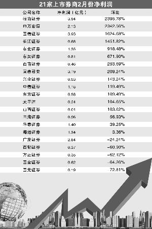 数据显示,国信证券2月份净利润环比增幅则超过16倍。增长迅猛的还有长江证券、东北证券和东吴证券,其中,长江证券净利润环比增幅超过14.5倍,东北证券环比增幅超过9倍,东吴证券环比增幅超过6.7倍。