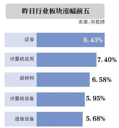 板块方面,据同花顺统计,昨日证券板块集体暴涨8.43%,国海证券、东吴证券、东兴证券、西部证券、第一创业、锦龙股份等多只个股涨停。