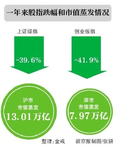 而和去年疯狂的大牛市相比,股民最近一年则人均亏损40.88万元。去年6月1日,当日沪指大涨报4828.74点,与昨日相比,一年跌去1900多点,跌幅高达39.6%;而创业板指则暴跌41.9%;沪深两市总市值蒸发20.98万亿元。