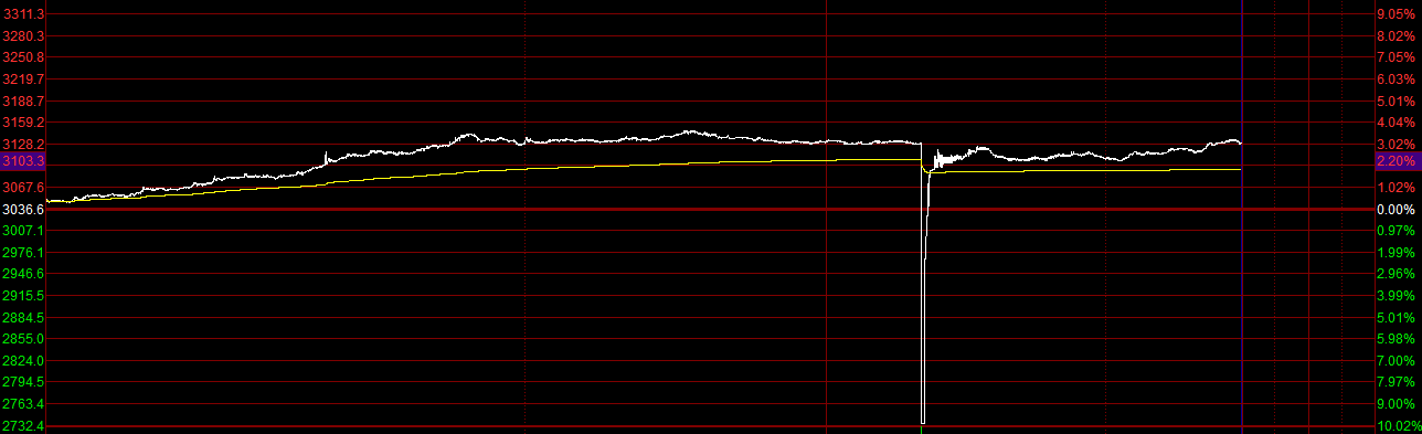 股指期货主力合约IF1606早盘一度走势平稳,稳步上涨至2%左右,10点42分,该合约毫无征兆地突然跌至2732.4点,触及跌停,7秒之后又快速涨回到逾2%。截至收盘,IF1606合约收于3158.8点,涨123点,涨幅4.05%。