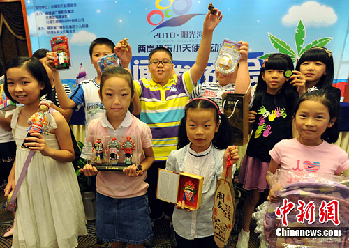 7月1日,在福州举行的“2010·阳光海峡——两岸快乐小天使活动营”的新闻发布会上,福建小营员代表们展示他们准备赠送给台湾小伙伴的礼物——泉州木偶、京剧脸谱、上海世博会吉祥物海宝、家中珍藏的福州三坊七巷明信片、邮票、魔术道具等。2010·阳光海峡——两岸快乐小天使活动营”将在7月5日到7月12日期间举行。届时,近100名台湾的小朋友将分别和福州、泉州、厦门的孩子们“同唱一首歌”、“同诵一篇章”、“同习一套拳”、“同游一江水”、“同看一出剧”、“同绘一幅画”,并有一次“同是一家人”般的亲切民宿体验。2010·阳光海峡——两岸快乐小天使活动营”是以海峡两岸少年儿童为主体的大型文化交流活动,也是目前海峡两岸文化交流中唯一由两岸媒体联合主办的交流活动,该活动曾于2007年和2008年成功举办了两届。中新社发 刘可耕 摄