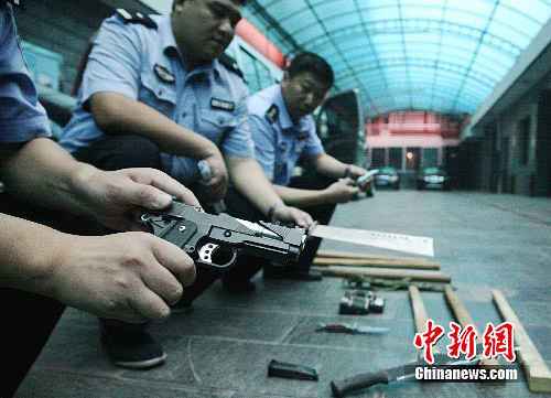 7月1日,河北警方向媒体透露,成功摧毁一个专门抢劫运粮食农车的犯罪团伙,已抓获8名犯罪嫌疑人,缴获2辆汽车、钢制手枪、刀棍等作案工具,案件正在进一步审理中。据警方介绍,时值河北夏粮丰收,农民收割运粮买卖不断,该犯罪团伙在衡水、藁城、行唐等各地疯狂作案20余起,给农民物质和精神造成严重的损害。自6月份开始,公安部部署全国公安机关开展为期7个月的严打整治行动,严厉打击各类严重暴力社会犯罪活动。图为石家庄长安区公安正清点缴获的作案工具。中新社发 翟羽佳 摄