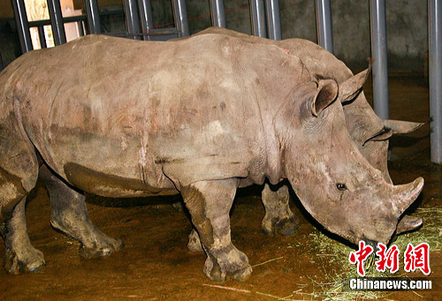 7月26日,云南省野生动物园从南非引进了12头白犀,将于近期与游客见面。这12头犀牛也是中国西南地区最大的犀牛种群,将对犀牛种群的保护及扩大有着深远的影响。图为27日,在隔离区的白犀。中新社发 刘冉阳 摄