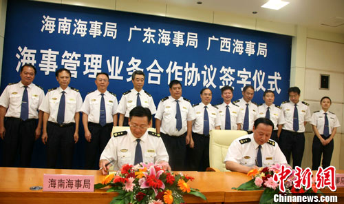 8月27日上午,海南海事局分别与广东海事局、广西海事局签署海事管理合作协议。此举意味着三地海事部门在海事管理业务上的合作开始迈进制度化的重要步伐,共同管理南中国海域,打造安全、畅通、高效、清洁的区域性海上交通安全环境。图为签字仪式现场。