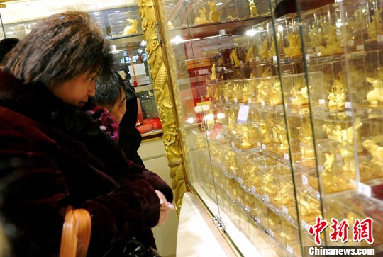 1月3日新年元旦假期,北京一家黄金卖场的2011年兔年贺岁黄金产品琳琅满目,各种造型可爱的兔年生肖饰品吸引各地顾客。中新社记者 张勤 摄