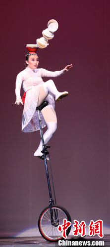 “四海同春”温哥华演出中,杂技家李欣宏在表演《高车踢碗》绝技。中新社发 赖海隆 摄