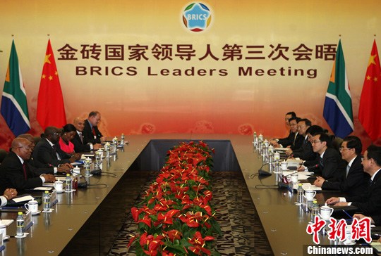 4月13日晚,中国国家主席胡锦涛在海南省三亚市亚龙湾会见前来参加“金砖峰会”的南非总统祖马。金砖国家领导人第三次会晤将于14日在这里举行,中国国家主席胡锦涛与巴西、俄罗斯、印度、南非等国的领导人将出席。 中新社发 任晨鸣 摄