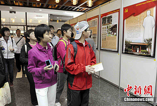 4月18日,学生们在北京大学图书馆内参观《铁肩担道义 妙手著文章——中国共产党创始人李大钊》专题展。北京李大钊故居推出纪念共产党成立90周年李大钊专题展览目前正在北京大学图书馆首展。专题展140余幅珍贵的历史照片,向大学生们讲述着李大钊短暂而光辉的一生,和他崇高的革命精神、伟大的人格魅力。李大钊专题展在北京大学展览之后,将在人民大学等多所高校巡回展出。中新社发 张勤 摄